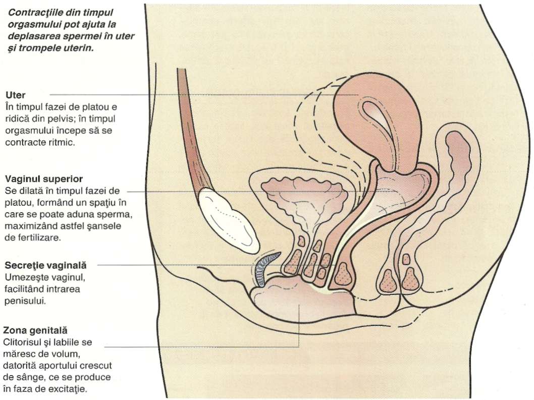 Contracţiile din timpul orgasmului se extind de-a lungul vaginului, în sus, către uter. Muşchii pelvisului şi perineului (regiunea corpului situată între anus şi vagin) şi cei din jurul vezicii urinare şi a rectului se contractă şi ei. Femeile resimt în general între 5 şi 15 contracţii în timpul orgasmului, în funcţie de intensitatea acestuia.