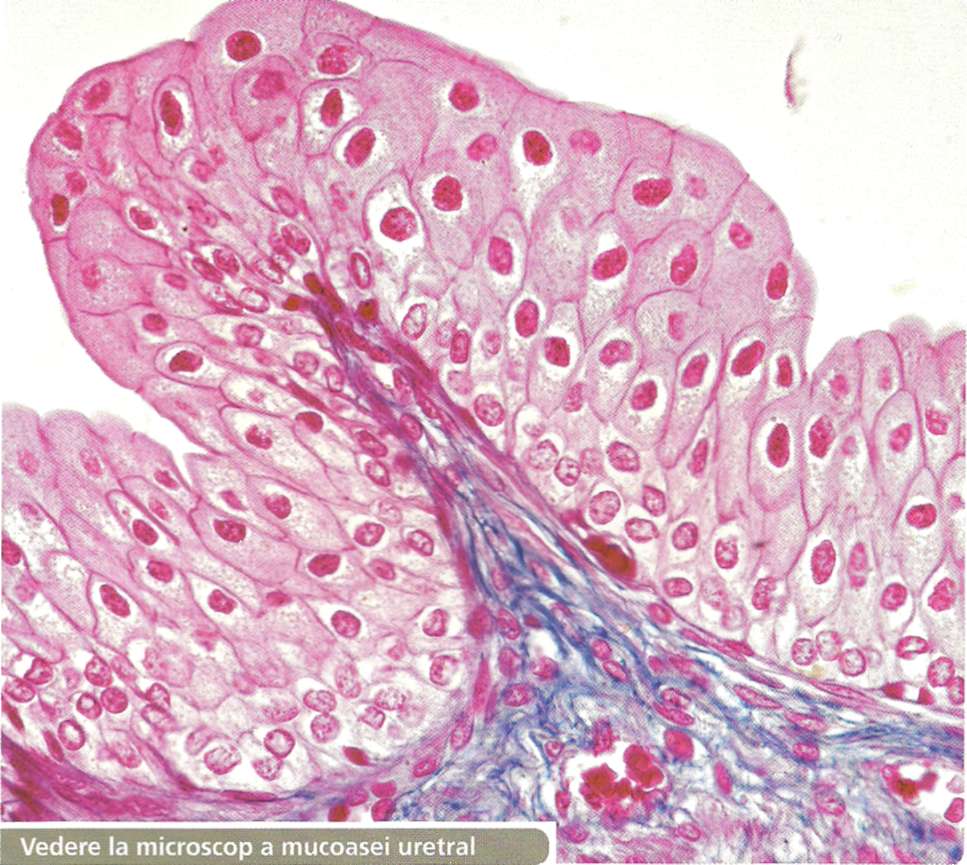 ► Mucoasele urinare nu au nici un rol de absorbţie sau de secreţie: mucoasa ureterului este acoperită cu un epiteliu polimorf, numit de tranziţie, care asociază mai multe straturi de celule cubice sau cilindrice, capabile să gliseze unele pe altele, pentru a rezista la variaţiile importante (presiune sau dilatare), în uretră, epiteliul stratificat este, pe rând, de tranziţie, în apropierea vezicii, cilindric, în partea din mijloc, şi pavimentos, în apropierea meatului urinar. Nefiind protejată de secreţii de mucus, uretra femeii este invadată cu uşurinţă de bacterii care provin din regiunea anală.
