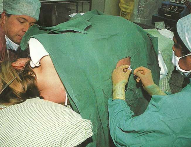 Doamna Mason a fost dusă în sala de operaţie, unde s-a aşezat într-o poziţie cât mai confortabilă, pe partea stângă, pe masa de operaţie. I s-a montat o linie venoasă, astfel încât să se poată administra rapid fluide şi medicamente în cazul unei scăderi a tensiunii arteriale. De asemenea, s-au monitorizat cu atenţie pulsul, saturaţia în oxigen, frecvenţa cardiacă şi tensiunea arterială.