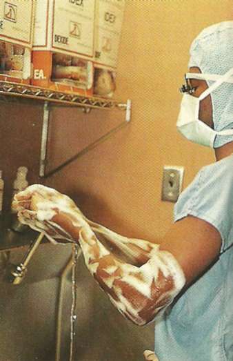 Anestezistul îşi curăţă mâinile cu soluţie antibacteriană, pentru a reduce la minimum riscul de infecţie.
