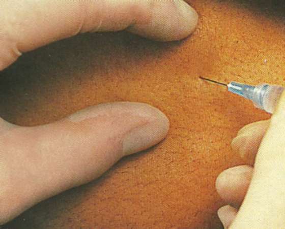 La nivelul unei mici zone de piele şi ţesut subcutanat, se injectează anestezic local.