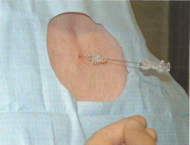 Odată ce anestezicul local şi-a făcut efectul, acul introductor este introdus prin pielea şi ligamentele dintre două vertebre.