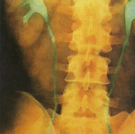 Această radiografie cu substanţă de contrast a tractulul urinar, evidenţiază două uretere de aspect normal. Aceste conducte musculare au traseu descendent, pe toată lungimea cavităţii abdominale.