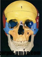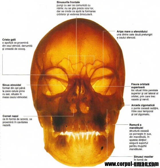 1. osul frontal 2.osul parietal 3. osul temporal 4. osul nazal 5. osul sfenoid 6. osul lacrimal 7. osul zigomatic 8. maxilarul 9. mandibula